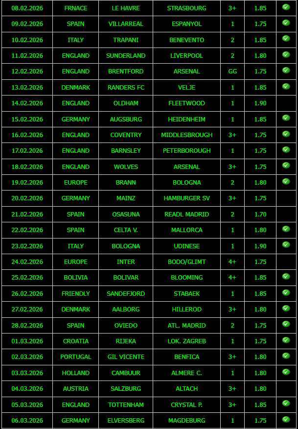 | 28.02.2026 | 18:30 | DORTMUND | BAYERN M. | 4+ | 2.00 | ![]() |